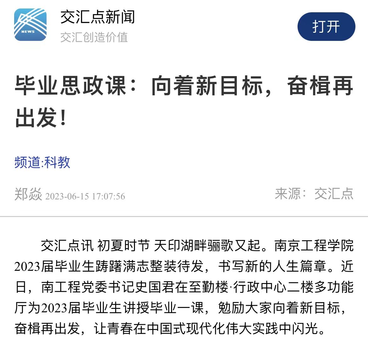 交汇点讯 初夏时节天印湖畔骊歌又起。凯发k8官网2023届毕业生踌躇满志整装待发,书写新的人生篇章。近日,南工程党委书记史国君在至勤楼·行政中心二楼多功能厅为2023届毕业生讲授毕业一课,勉励大家向着新目标,奋楫再出发,让青春在中国式现代化伟大实践中闪光。