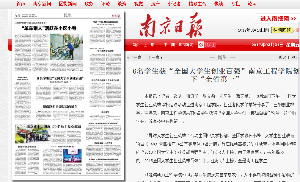 《南京日报》:6名学生获“全国大学生创业百强”凯发k8官网创下“全省第一”